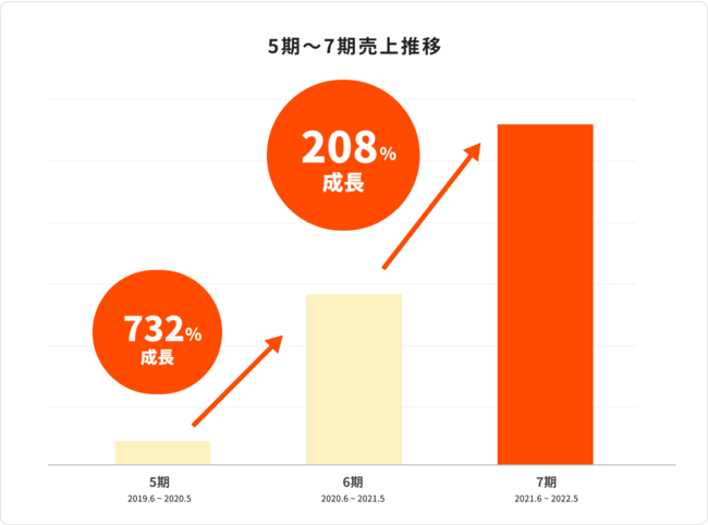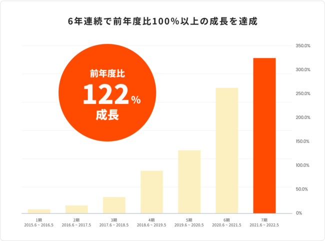2021年度の売上は前年度比122%となりました。これで2015年の創業以来、6年連続で前年度比の売上を上回る右肩成長を記録しました。