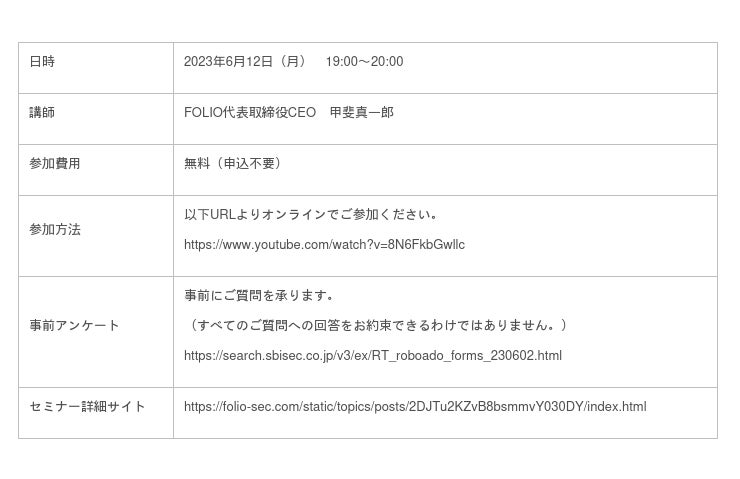 これを記念して、SBI証券およびFOLIOは、お客さまにFOLIOがご提供する「AI投資」の競争力についてよりご理解を深めていただくためのセミナーを、2023年6月12日(月)19時より開催します。