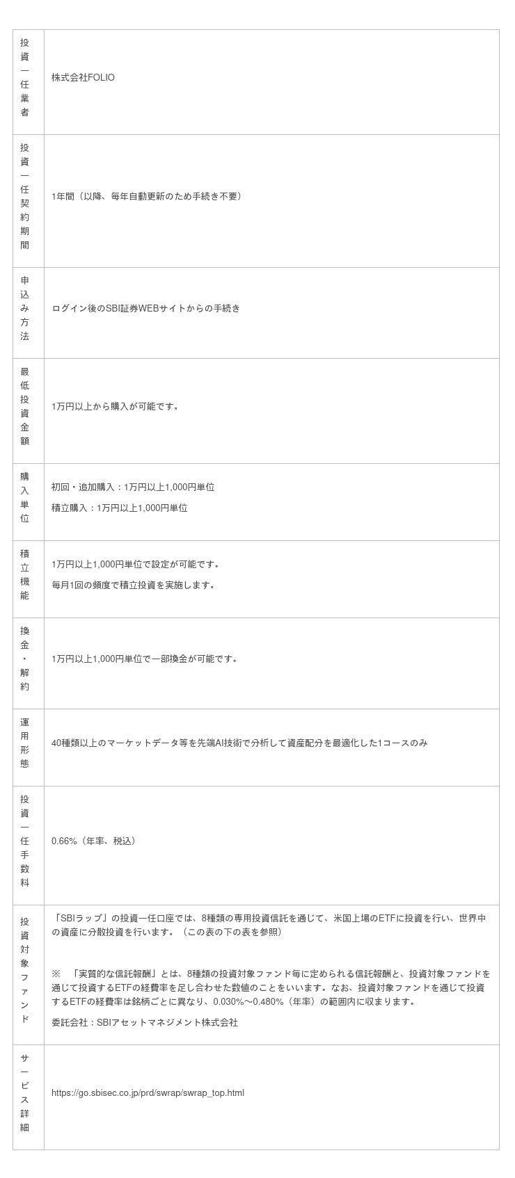 SBI証券とFOLIOは、多様な投資一任サービスの提供を可能にするシステムプラットフォーム「4RAP」の特性を活かし、第1弾商品としてFOLIO が培ってきたAI 運用ノウハウを活用した『AI×投資一任(ラップ)』という新しいジャンルの投資一任サービス「SBIラップ」を提供しています。今後も、「顧客中心主義」のもと、顧客の長期投資に資する第2弾、第3弾となる投資一任サービスを提供すべく、独自の運用ノウハウを有する運用会社との共同開発を進めています。