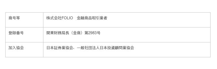 FOLIOで取り扱っている商品等へのご投資には、商品毎に所定の手数料や必要経費等をご負担いただく場合があります。また、金融商品の取引においては、株価、為替、金利、その他の指標の変動等により損失が生じ、投資元本を割り込むおそれがあります。ご契約の際は契約締結前交付書面等の内容を十分にご確認ください。