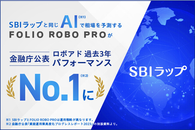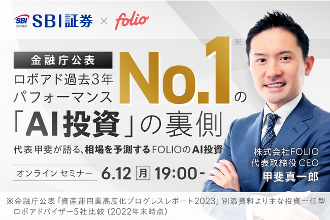 株式会社SBI証券(本社:東京都港区、代表取締役社長:高村正人、以下「SBI証券」)と株式会社 FOLIO (本社:東京都千代田区、代表取締役 CEO :甲斐真一郎、以下「FOLIO」)は、投資一任サービス「SBIラップ」と同じAI※1で相場を予測する「FOLIO ROBO PRO」が金融庁公表のロボアド過去3年パフォーマンスでNo.1※2を獲得したことを記念し、6月12日(月)にオンラインセミナーを開催することをお知らせします。
