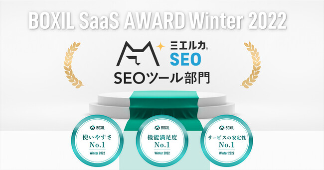 「BOXIL SaaS AWARD(ボクシル サース アワード)」は、スマートキャンプが運営するSaaS比較サイト「BOXIL SaaS(ボクシル サース)」が、優れたSaaSを審査、選考、表彰するイベントです。今回の「BOXIL SaaS AWARD Winter 2022」は、2021年10月1日から2022年9月30日までの1年間で新たに投稿された口コミ約10,000件を審査対象としており、「ミエルカ」は「SEOツール部門」で「使いやすさNo.1」,「機能満足度No.1」,「サービスの安定性No.1」に選ばれました。また、その証としてそれぞれのNo.1バッジが、スマートキャンプから付与されました。