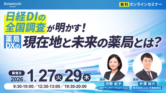 株式会社ソラミチシステム クラウド電子薬歴『CARADA 電子薬歴 Solamichi』の企画・開発・販売を行う株式会社ソラミチシステムは、無料オンラインセミナー「日経DIの全国調査が明かす!薬局DXの現在地と未来の薬局とは?」を1月27日(火)、29日(木) に開催します。