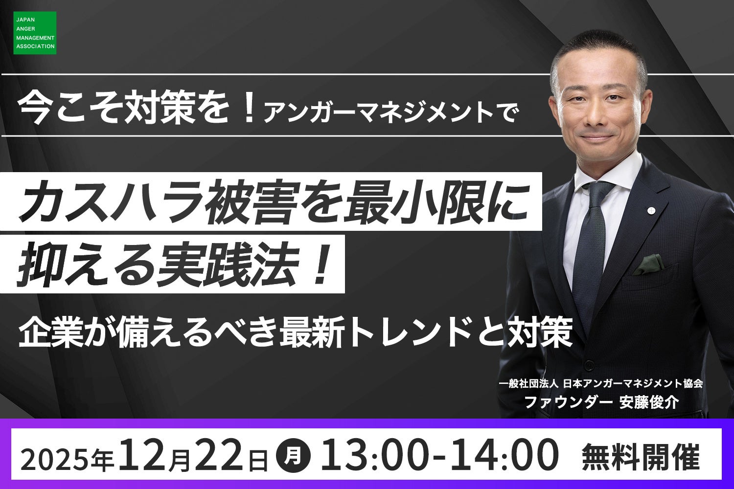 株式会社レビックグローバル(本社:東京都港区、代表取締役社長:柏木 理)が運営する一般社団法人日本アンガーマネジメント協会(所在地:東京都港区、代表理事:戸田久実)は、昨年10月に開催し好評を博した無料オンラインセミナー「今こそ対策を!アンガーマネジメントでカスハラ被害を最小限に抑える実践法」を2025年12月22日(月)13時よりアーカイブ配信します。