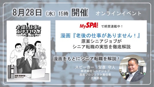 そこで今回、2024年8月28日(水)にオンラインイベント「老後の仕事がありません!解説」を開催し、シニアジョブ漫画プロジェクト責任者として原案作成に携わった広報部長の安彦守人が、漫画のシーンをもとに、実際のシニア転職やその支援を解説します。MySPA!の協力のもと、漫画のシーンを活用することで、視覚的にもわかりやすいシニア転職の解説となります。