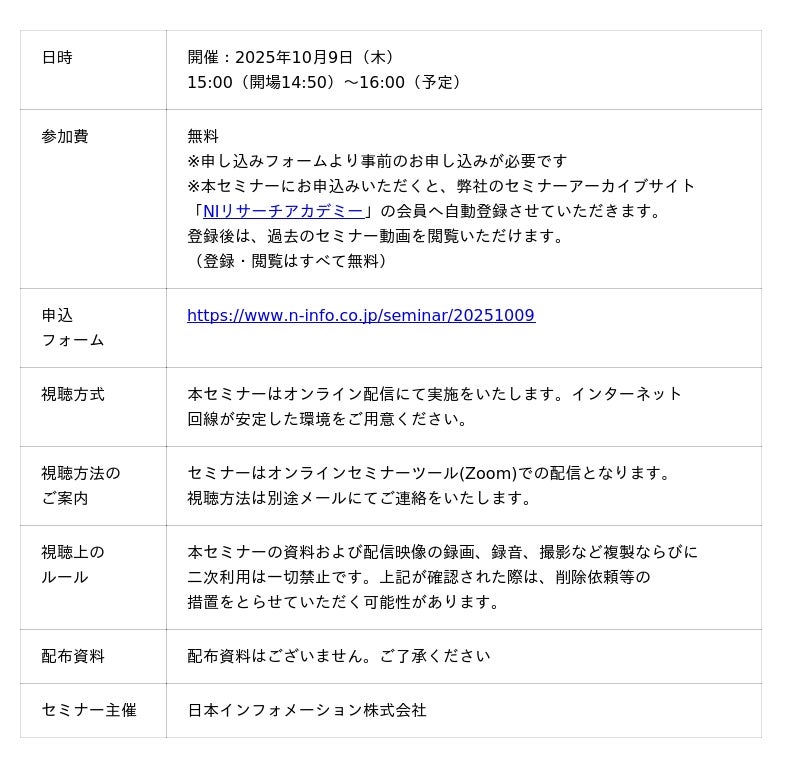 総合マーケティングリサーチ会社の日本インフォメーション株式会社(本社:東京都中央区、代表取締役社長:斎藤啓太)は、2025年10月9日(木)15:00より元日産自動車株式会社の高橋氏を講師にお迎えして、無料オンラインセミナーを開催します。
