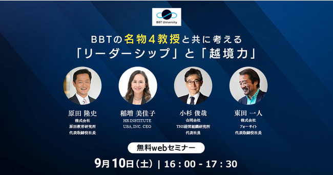 あらゆる年齢層に対し生涯にわたるリカレント教育(※1)を提供する株式会社ビジネス・ブレークスルー(所在地:東京都千代田区、代表取締役:柴田巌、以下BBT)が運営する、ビジネス・ブレークスルー大学大学院(所在地:東京都千代田区、学長:大前研一、以下BBT大学大学院)は、キャリアセミナー『BBTの名物教授4人とリーダーシップについて共に語ろう!~人生100年時代の必須アイテム「越境力」 あなたらしいリーダーシップとは何か~』を9月10日(土)16時からオンラインにて開催いたします。