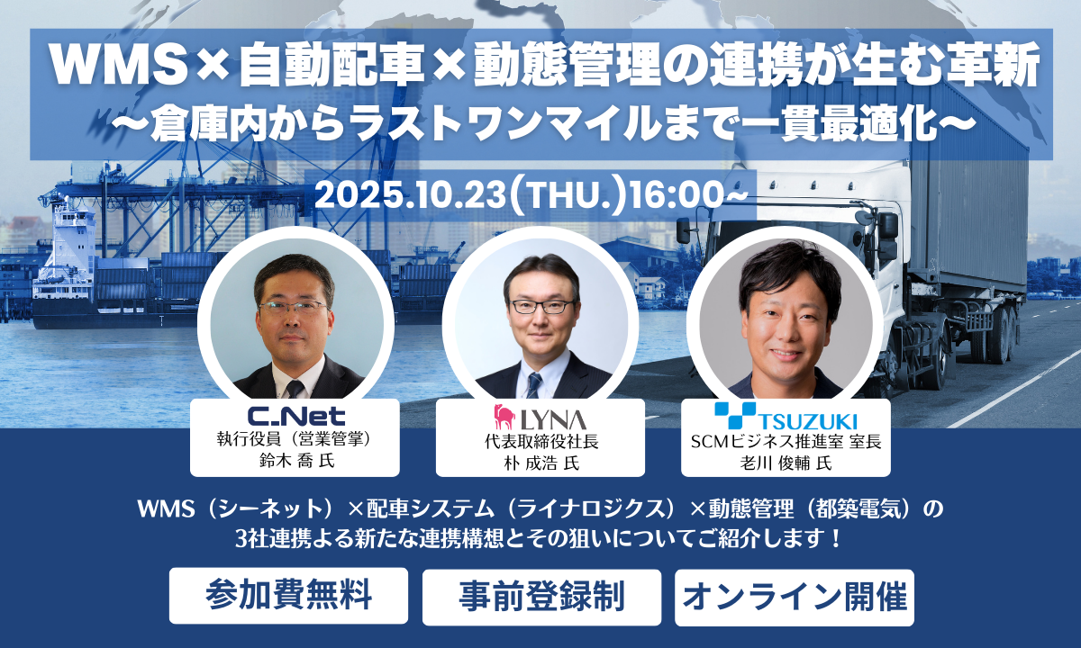クラウド型倉庫管理システム(WMS)の開発・提供を手掛ける株式会社シーネット(本社:千葉県千葉市、代表取締役社長:小野崎伸彦)は、株式会社ライナロジクス(本社:千葉県市川市、代表取締役社長:朴成浩)、都築電気株式会社(本社:東京都港区、代表取締役社長:吉田 克之)と共同で、2025年10月23日(木)16時より、「WMS×自動配車×動態管理の連携が生む革新~倉庫内からラストワンマイルまで一貫最適化~」と題したオンラインセミナーを開催することをお知らせいたします。