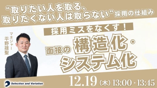 https://sele-vari.co.jp/ )は「採用ミスをなくす!面接の構造化・システム化~取りたい人が取れない、取りたくない人を取ってしまわないように~」セミナーを2024年12月19日(木)13:00~13:45に開催することをお知らせいたします。