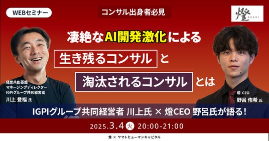 ヤマトヒューマンキャピタル株式会社(本社:東京都千代田区、代表取締役:堀江 大介)は、2025年3月4日(火) 20:00よりオンラインにて、燈株式会社CEO 野呂 侑希 氏、株式会社経営共創基盤 マネージングディレクター IGPIグループ共同経営者 川上 登福 氏にご登壇いただくウェビナー『凄絶なAI開発激化による生き残るコンサルと淘汰されるコンサルとは』を開催いたします。