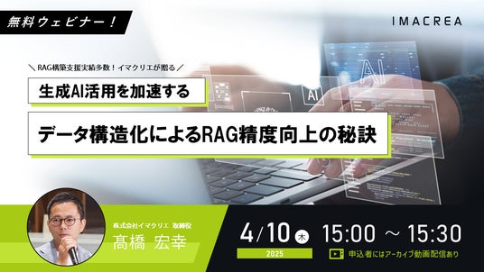 株式会社イマクリエ(本社:東京都港区 代表取締役:鈴木信吾、以下、当社)は、自社データを生成AIで活用し、業務効率化・自社データの価値創造を図りたい経営者様やDX推進部門担当者様へ向けたオンラインセミナー「生成AI活用を加速する!データ構造化によるRAG精度向上の秘訣」を開催することをお知らせします。