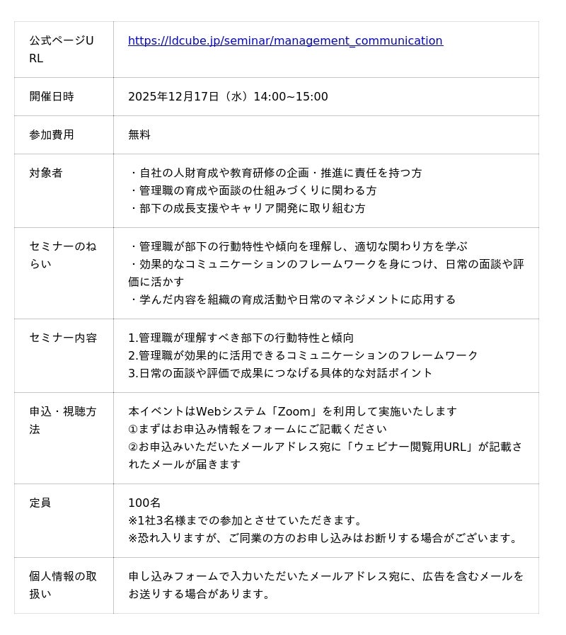 研修のスタイルにとらわれない企業向け人材育成サービスを提供する株式会社LDcube(本社:東京都千代田区、代表取締役社長:新井澄人、以下「当社」)は、「"部下理解×対話力"で変わる管理職育成とは~部下の行動特性に合わせた関わり方のポイントを解説!~」と題してウェビナーを開催しますので、お知らせします。