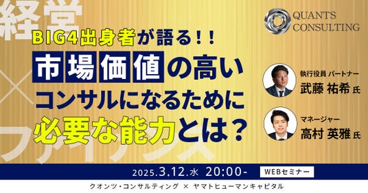 ヤマトヒューマンキャピタル株式会社(本社:東京都千代田区、代表取締役:堀江 大介)は、2025年3月12日(水) 20:00よりオンラインにて、株式会社クオンツ・コンサルティングの執行役員パートナー武藤 祐希 氏とマネージャー高村 英雅 氏にご登壇いただくウェビナー『真に市場価値の高いコンサルになるために経営とファイナンス能力を兼ね備えろ?!』を開催いたします。