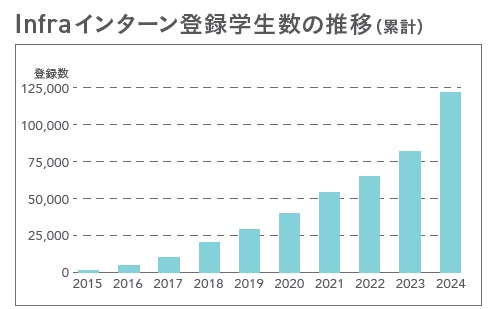 長期インターンサイトを運営する「Infra」の学生登録数は、サービス開始の2015年から増加を続け、累計12万人を突破。直近3年間の伸びは約2倍と特に顕著で、年々ニーズが高まっていることがわかります。