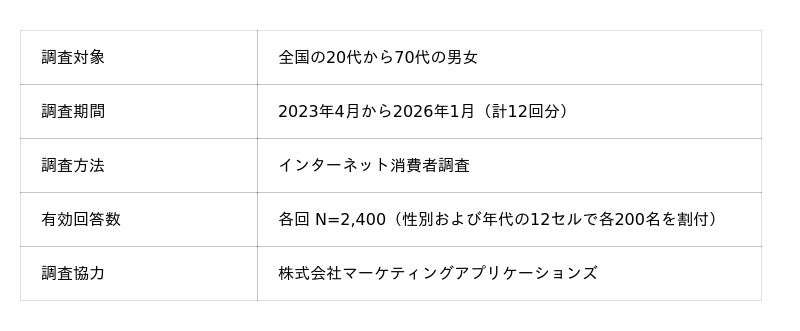 サマリー(概要)本調査の「ショッパー暮らし向きD.I.」とは、現在の暮らし向きについて、3か月前と比較した変化を5段階で聴取し算出する指標です。2025年4月にマイナス36.2を記録して以降、3回連続で上昇し、2026年1月にはマイナス17.5に到達しました。