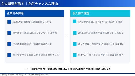 株式会社給与アップ研究所企業の52.4%が評価制度に課題、副業人材の約4割が月5万円未満──なぜ“スキルがあっても稼げない”のか?両側の課題を解決する新たなキャリアとは