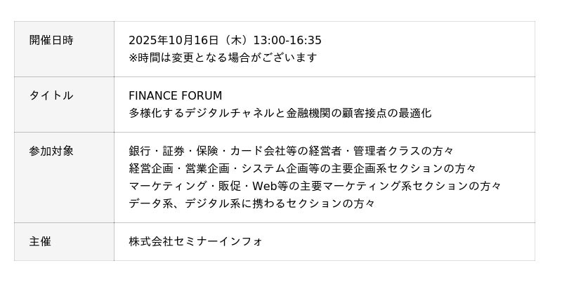 株式会社セミナーインフォ(本社:東京都千代田区 代表:小西 亘)は、2025年10月16日(木)にFINANCE FORUM「多様化するデジタルチャネルと金融機関の顧客接点の最適化」を開催することとなりました。一緒に本イベントを盛り上げていただける協賛企業様を募集しております。サービス資料ダウンロードはこちらから:https://si-forum.jp/ff251016dlご利用企業様の声:https://service.seminar-info.jp/casestudy