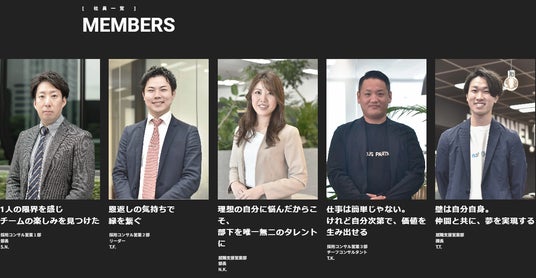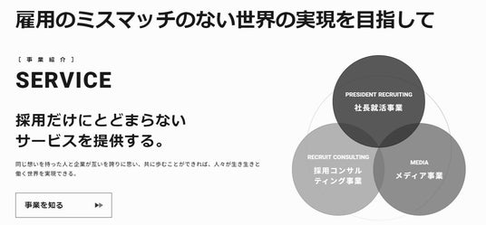 事業やサービスの特徴をわかりやすく紹介し、求職者が自身のキャリアビジョンと一致するかを判断しやすいよう、一目で理解できるページ構成にしています。