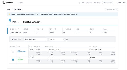 今回の機能改善で、Shirofuneに接続したAmazon広告アカウントで自動で最適化または運用者が手動で調整した入札に対して、「ターゲティングコンフリクト」により広告パフォーマンスに影響を及ぼ巣可能性があるキーワードを広告グループ横断で自動抽出し、改善カードとして除外提案が表示されます。