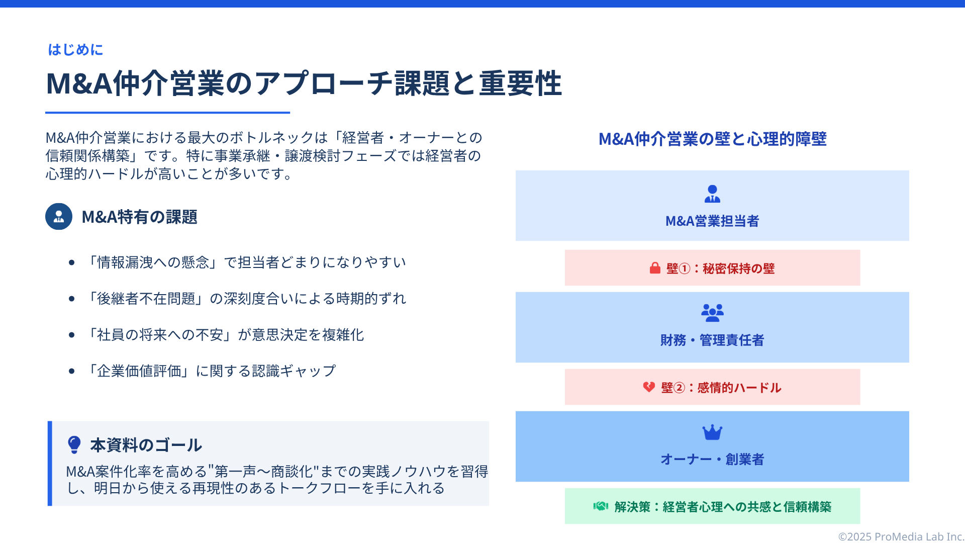 株式会社プロメディアラボ(本社:東京都中央区、代表取締役:廣瀬義憲)は、M&A営業における「経営者・オーナーアプローチ」の成功ノウハウをまとめた資料『経営者アプローチの極意 ~断られないM&Aヒアリングとオーナーとの信頼構築で成約率を最大化~』を公開しました。