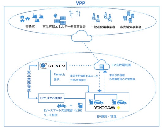 REXEV横河レンタ・リース株式会社(本社:東京都新宿区、代表取締役社長 山崎 正晴、以下 「横河レンタ・リース」)、芙蓉総合リース株式会社(東京都千代田区、代表取締役社長 織田寛明、以下「芙蓉リース」)の連結子会社である芙蓉オートリース株式会社(本社:東京都千代田区、代表取締役社長 長野 克宣、以下「芙蓉オートリース」)、株式会社REXEV(本社:東京都千代田区、代表取締役社長 渡部 健、以下「REXEV」)は、電気自動車(以下「EV」)をエネルギーマネジメントシステム*1により効率的に運用することで、個々に点在するEVを集約し、EV由来の大規模な需給調整力を発揮するVPP*2の構築に向けた実証事業(以下「本事業」)を開始しました。