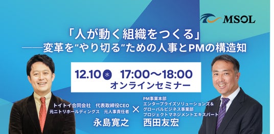 組織変革(DX・生産性向上・人材育成)を推進する経営層・事業責任者などの方を対象に、現場で“人が動く組織”をつくり、変革プロジェクトを確実にやり切るための考え方や視点を持ち帰っていただくことを目的としたオンラインセミナーを、株式会社マネジメントソリューションズ(本社:東京都港区、代表取締役社長兼CEO:金子啓、以下 MSOL)が2025年12月10日(水)に開催いたします。