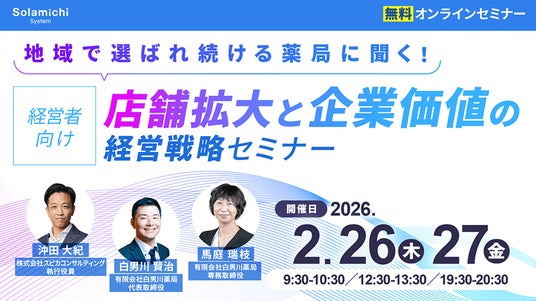 株式会社ソラミチシステム クラウド電子薬歴『CARADA 電子薬歴 Solamichi』の企画・開発・販売を行う株式会社ソラミチシステムは、無料オンラインセミナー「【経営者向け】地域で選ばれ続ける薬局に聞く!店舗拡大と企業価値の経営戦略セミナー」を2月26日(木)、27日(金)に開催します。