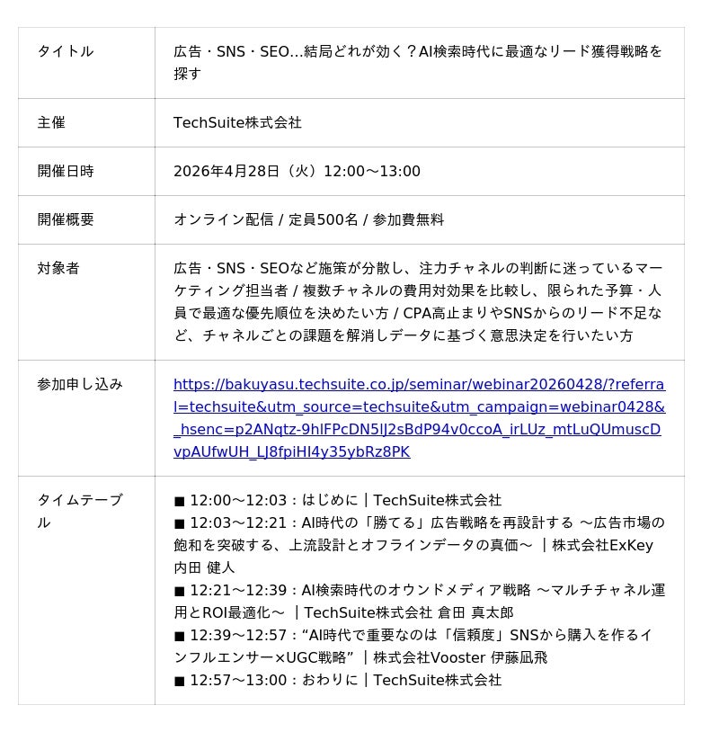 TechSuite株式会社(テックスイート/COO バクヤスAI事業統括 倉田 真太郎)は、2026年4月28日(火)にTechSuite株式会社が主催するオンラインウェビナー「広告・SNS・SEO…結局どれが効く?AI検索時代に最適なリード獲得戦略を探す 」に登壇します。参加申し込みはこちら広告・SNS・SEOと施策を幅広く展開しながらも、「どこに集中すべきかわからない」と悩むマーケティング担当者が増えています。広告のCPA高騰、SNSのリード転換の見えにくさ、SEOの成果までの時間--チャネルごとの正解が不透明なまま、施策だけが分散してしまうケースが少なくありません。