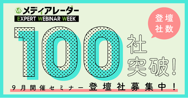 株式会社アイズ(所在地:東京都渋谷区、代表取締役社長:福島範幸)が運営する国内No.1*の広告媒体資料・マーケティング資料のポータルサイト「メディアレーダー」が主催する大型セミナーイベント「EXPERT WEBINAR WEEK」の登壇社数が合計100社を突破しました。