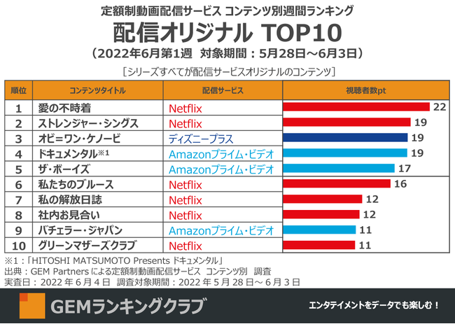 エンタテイメント業界に向けたデータ×デジタルマーケティングサービスを提供するGEM Partners株式会社(ジェムパートナーズ、所在地:東京都港区、代表取締役:梅津文)は6月10日(金)、エンタメコンテンツランキングやデータ情報を発信する「GEMランキングクラブ」プロジェクトにて作成した2022年6月第1週の「定額制動画配信サービス コンテンツ別週間ランキングTOP20(調査対象期間:5月28日~6月3日、調査対象:日本在住15~69歳男女)」を発表します。