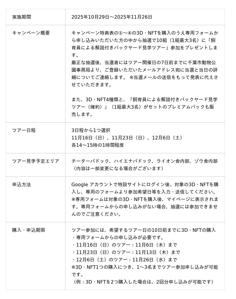 販売開始を記念して、3D・NFTを購入のうえ専用フォームから申し込みいただいた方から抽選で10組(1組最大3名)を、動物公園の裏側をより深く知ることのできる、「飼育員による解説付きバックヤード見学ツアー」にご招待します。また、3D・NFT 4種類にバックヤード見学ツアー(確約)がついたプレミアムパックもご用意しております。