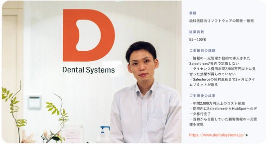 デンタルシステムズ様のSalesforceからHubSpotへの移行プロジェクトの詳細は、株式会社100のウェブサイトでご覧いただけます。事例ページでは、短期間でのデータ移行と営業プロセスの再設計によって、年間2,000万円以上のコスト削減を実現した過程や成果を紹介しています。