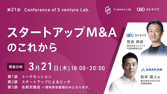 株式会社ストライク(本社:東京都千代田区、代表取締役社長:荒井邦彦)は、スタートアップ企業と事業会社の提携促進を目的としたサービス『S venture Lab.』を運営しております。3月21日(木)にMIDORI.so NAGATACHO にて第21回:Conference of S venture Lab.を開催いたします。