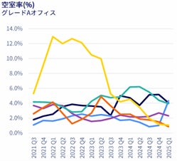 空室率は前期比3.3ポイント上昇の4.3%と一時的な上昇が見られましたが、これは一部大型テナントの移転によるもので、全体として堅調な需要は継続しており、長期的な空室率上昇の兆候は見られません。