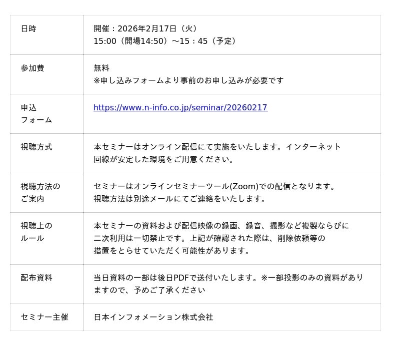 総合マーケティングリサーチ会社の日本インフォメーション株式会社(本社:東京都中央区、代表取締役社長:斎藤啓太)は、2026年2月17日(火)15:00よりLINEヤフー株式会社の棈野氏をお迎えし、無料オンラインセミナーを開催します。