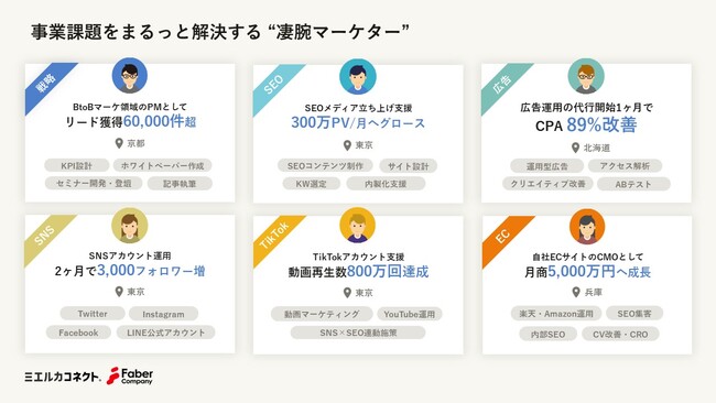 約1,700社のWebマーケティングを支援中の株式会社Faber Company(ファベルカンパニー/本社:東京都港区、代表取締役:稲次正樹・古澤暢央)は、Webマーケティング専門の人材マッチングサービス「ミエルカコネクト」において、プロフェッショナル人材の登録者数が1,000名に達したことをお知らせいたします。