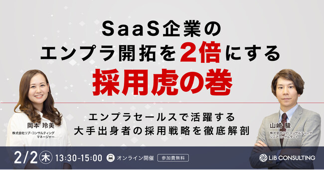ベンチャー・スタートアップのコンサルティングを得意とする株式会社リブ・コンサルティング(本社:東京都千代田区、代表取締役:関 厳)は、社員数50~100名規模のSaaSベンチャー・成長企業が抱える「ベンチャーで活躍する大手企業出身者の見極め・採用」というテーマの基、エンプラセールス人材の獲得という点にフォーカスをおき、定義すべき人材要件、母集団形成から面接手法など具体的なTipsも含めてお伝えするセミナーセミナーを2023年2月2日(木)に開催いたします。