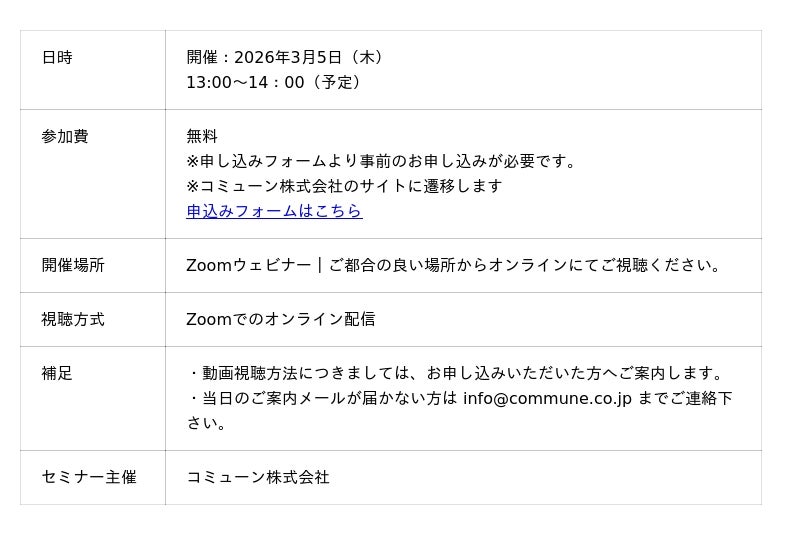 総合マーケティングリサーチ会社の日本インフォメーション株式会社(本社:東京都中央区、代表取締役社長:斎藤啓太)は、2026年3月5日(木)13:00よりコミューン株式会社とともに、無料オンラインセミナーを開催します。