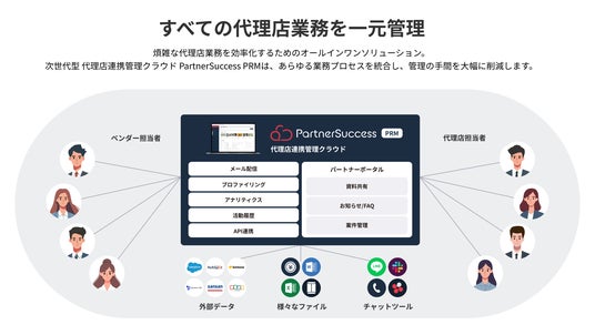 PartnerSuccess PRMは、代理店管理・情報共有・コミュニケーションを一元管理しデータを可視化し有効な代理店支援を行うことができる次世代型・代理店連携管理クラウドです。