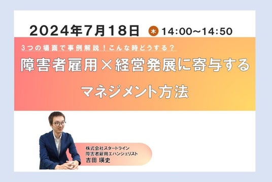 また、当社が監修した「障害者雇用場面ごとの対応例」コースに関連した特別セミナーを2024年7月18日(木)に開催します。障害者マネジメントにおいて、トラブルやミスが起きやすい「新規業務依頼時」、「繁忙期」、「体制変更時」の3つの場面での事例を解説します。参加費無料のセミナーですので、ぜひご参加ください。