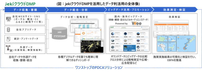 株式会社ジェイアール東日本企画(本社:東京都渋谷区、代表取締役社長:赤石 良治、以下jeki)は、2020年3月に業務提携を開始したアジアビッグデータカンパニーVpon JAPAN株式会社(本社:東京都新宿区、代表取締役社長:篠原好孝、以下Vpon)と協力し、行政の多岐にわたる分野のデータ収集・蓄積~可視化~分析~戦略策定~実行~検証~改善のPDCAプロセスの一元的管理を可能にする『jekiクラウドDMP』を自治体へ提供し、様々な社会課題解決に向けた、自治体DXおよびEBPM※2推進を一気通貫でサポートいたします。