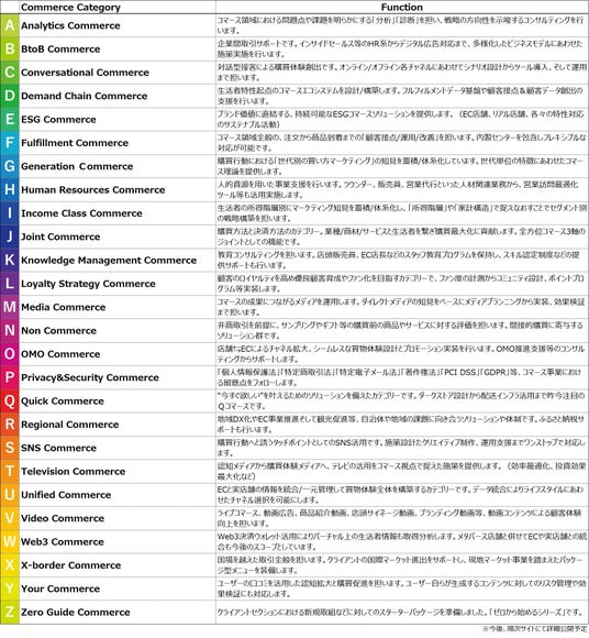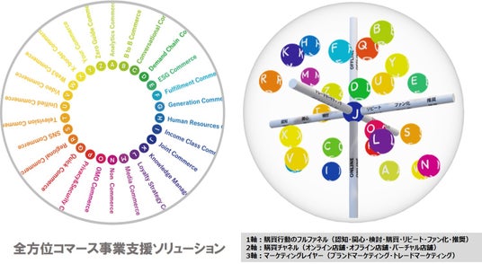 この「全方位コマース事業支援ソリューション」は、購買行動を「線」で捉えた1軸のマーケティングではなく、購買チャネルやマーケティングレイヤーを加えた3軸をクロスさせ立体的に捉えることができるので、統合的な視点で生活者の購買行動を捉えることができます。また、それぞれ「点」であったコマース領域の課題を立体で俯瞰して見ることで、クライアントが抱えている潜在ニーズの把握が可能となります。そのニーズや課題解決策を26のカテゴリーに分け、それらを企画から実施までワンストップで対応することで、クライアントの事業支援を中長期的にサポートいたします。