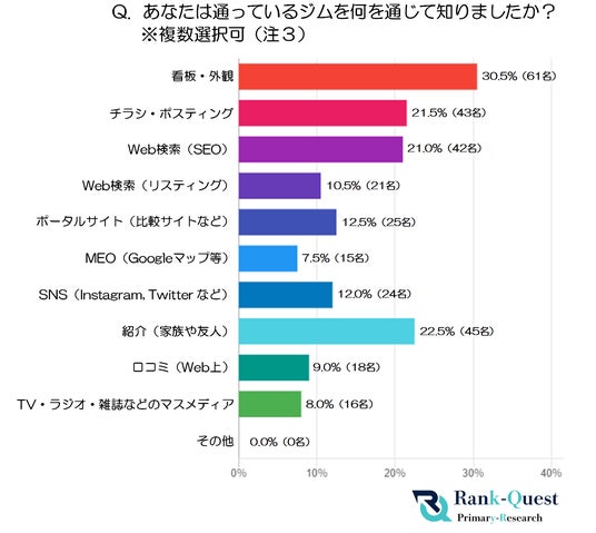 https://rank-quest.jp/column/column/how-to-seo/ )は、独立開業したフィットネスジム経営者200名と実際のジム利用者200名を対象に、『フィットネスジムを知ったきっかけ(認知経路)』に関する調査を実施しました。