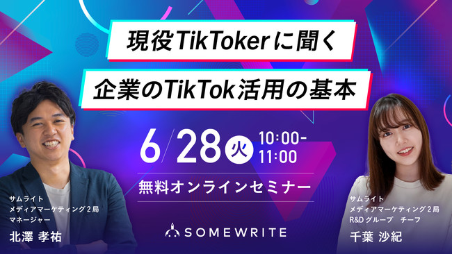 企業のコンテンツマーケティングやメディアビジネス等を支援するサムライト株式会社(本社:東京都渋谷区、代表取締役CEO:池戸聡、以下「サムライト」)は、「TikTok売れ」が注目を集め、ビジネスシーンにおける活用が急速に進んでいるTikTokについて解説するウェビナーを6月28日(火)に開催します。
