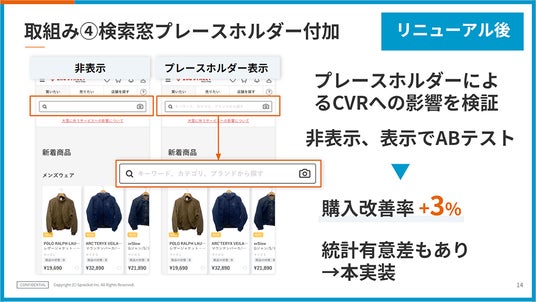 紹介された事例の中に、検索ボックスのUI改善があります。リニューアル後は検索ボックスを利用した後の成果が下がっており、Sprocketのシナリオで検索ボックスのプレースホルダ(デフォルトで表示されている文字列)を書き換えて検証したところ、購入完了率が改善することがわかりました。これも、その後サイトの機能として実装されています。