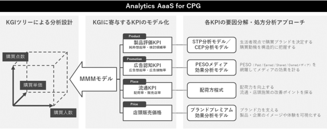 Analytics AaaS for CPGでは、この3つの課題に対応、消費財カテゴリーでのマーケティング施策とセールスとの関係を解明し、プロモーションだけでなく店頭・流通施策、配荷力に対しても改善に向けた示唆を得ることを可能にしています。