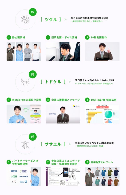具体的には、地方出身のタレントの静止画/動画素材(ツクル)、タレントによるSNSでの告知や応援動画メッセージ(トドケル)、各パートナー企業によるサービス優待(ササエル)といった、さまざまなサポートがセットになった、革新的なプランです。