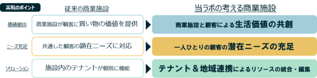 コンセプトは、モノからコトへという時代の変化の先を見据え、商業施設が「生活の場」として、生活のあらゆる時間に寄り添い「生活の質の向上」そのものを目指していくものです。内容は当ラボが開設したウェブサイトにてご覧いただけます。