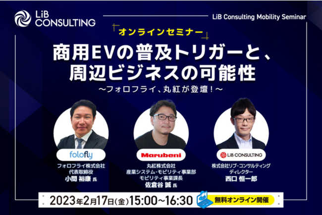 株式会社リブ・コンサルティング(本社:東京都千代田区、代表取締役:関 厳)は、EVシフトにおける新たな事業領域への参入に取り組まれる企業の方を対象とした、「商用EVの普及と周辺ビジネス」をテーマとしたウェビナーを2023年2月17日(金)に開催いたします。