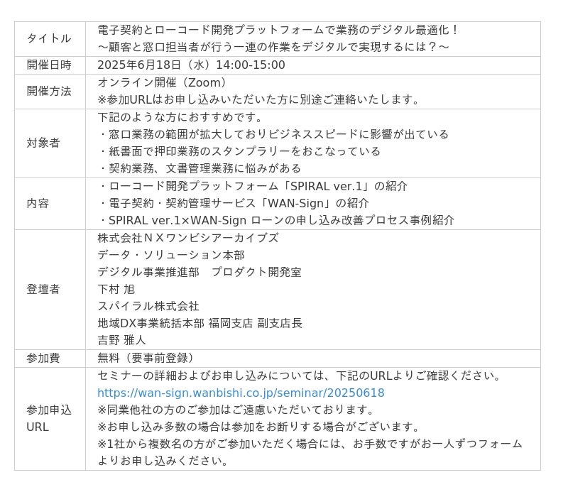 そうした市場ニーズに応えるべく、このたび当社とNXワンビシアーカイブズは、ローコード開発プラットフォーム「SPIRAL ver.1」と電子契約・契約管理サービス「WAN-Sign」のサービス連携を開始しました。これにより、ローンの申込受付から契約締結までをシームレスにつなぎ、金融機関および不動産業界の窓口担当者の業務効率化と申込者の利便性向上に貢献いたします。
